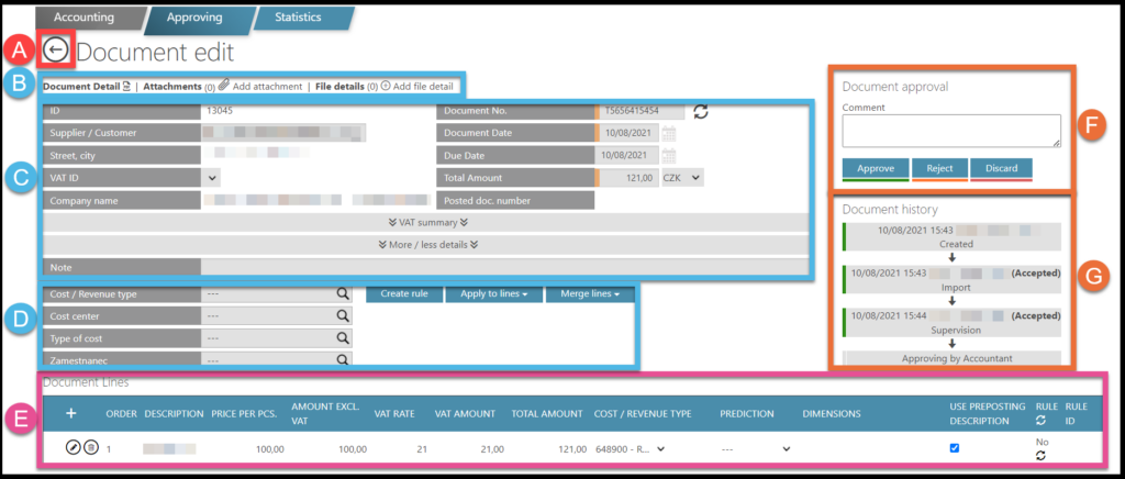 G) Document history – a list of all actions – workflow changes and document changes in the invoice.