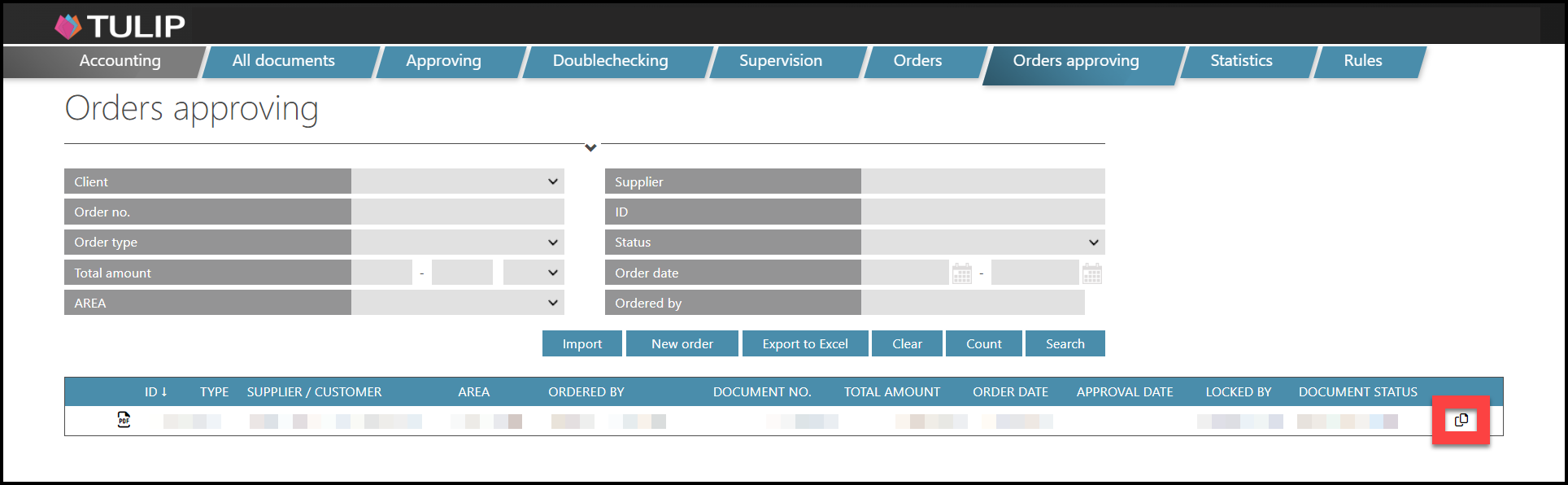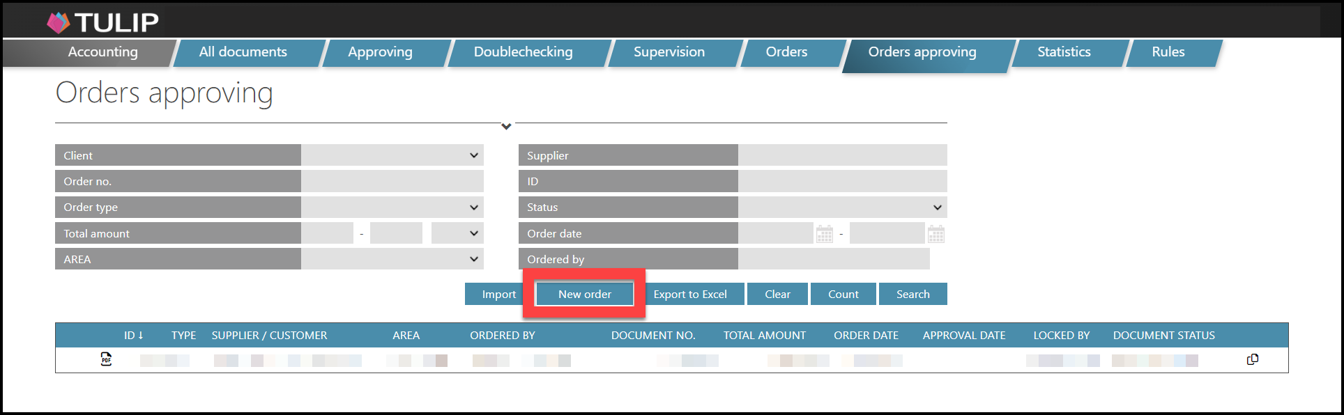 This manual includes information on creating new Orders or copying an existing Orders from Accounting module in TULIP. Usually, the Order is created by a customer. Then, it is sent to a pre-set number of approval steps (1 to 7) all according to AREA / Approval matrix. It is also possible to import Orders, send them for approval, create PDF documents to send in e-mails and pair Orders with Invoices.