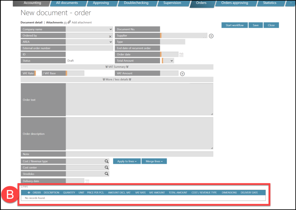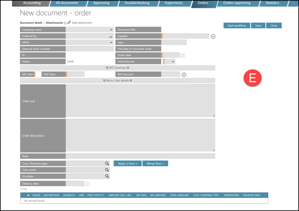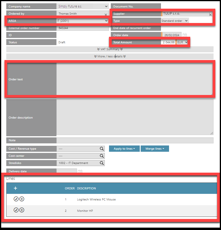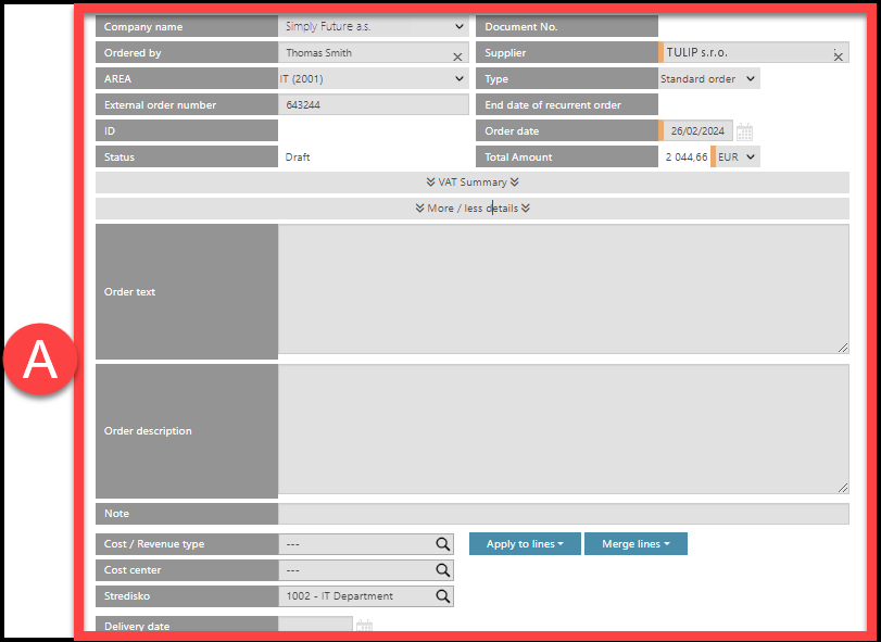 - Total amount – Automatically filled in after filling in the lines below. A default currency is set up in the company settings. To enable local & other currencies, they must be listed in the approval matrix – the reason is that the approval of Orders in other currencies is checked based on this data.
