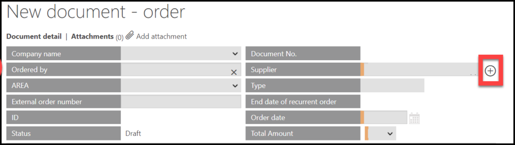 - The “+” icon: If the Supplier does not exist, it is necessary to add a new supplier into the system. Only users with a Supervision access role that allows them to process those Orders (Orders without suppliers are in “Supervision” status) can add new. Click on the “+” icon next to the Supplier field to create a new Supplier.