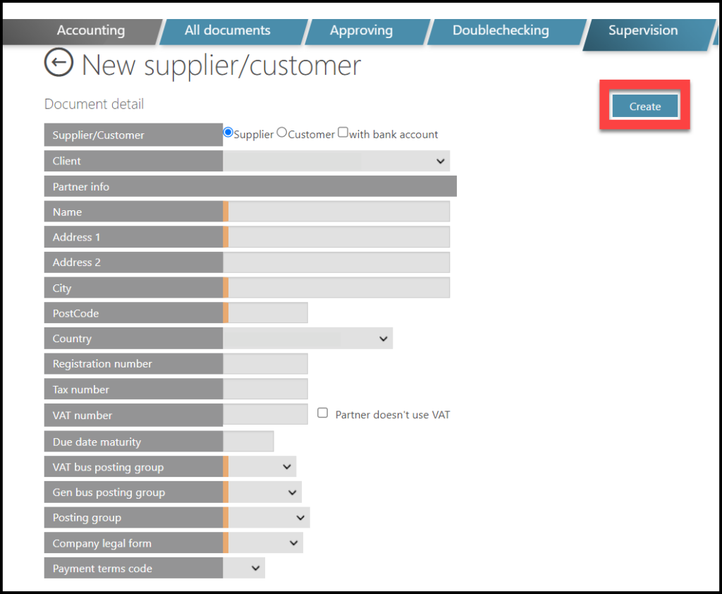 - When you add a new supplier, a new window opens. You must fill in the data with an orange stripe. Then, click on the Create button on the right to save data.