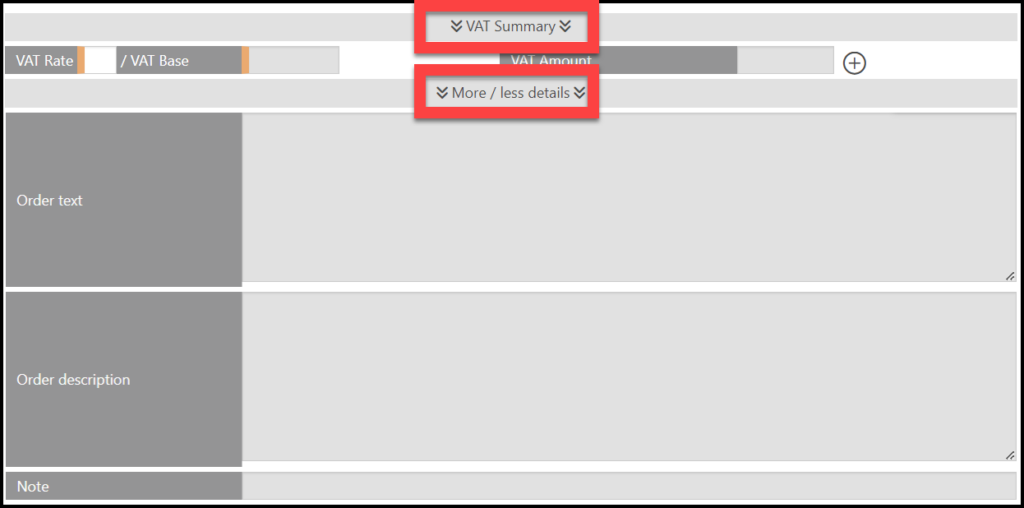 - VAT summary – Those fields are automatically counted and filled in based on the amount in lines. Please add lines (individual items of the Order) to have those fields automatically filled in. Do not edit this data if not necessary. To add amounts manually, click on the “+” icon.
