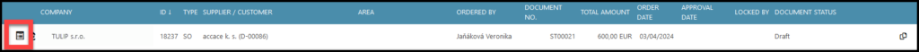 Here you can display the PDF of the order (click on Document detail) or display or add another attachment (click on Add attachment).