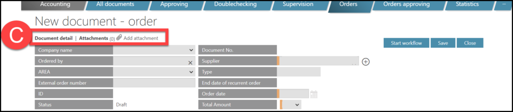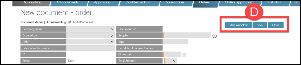 - Start workflow – based on the approval matrix, the whole Order is sent to next step/approver. It is not possible to edit it afterwards.