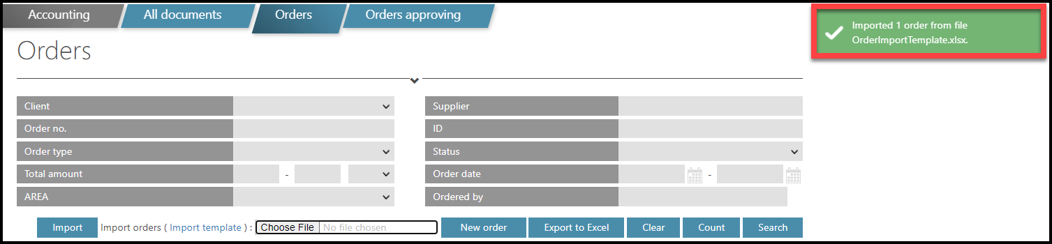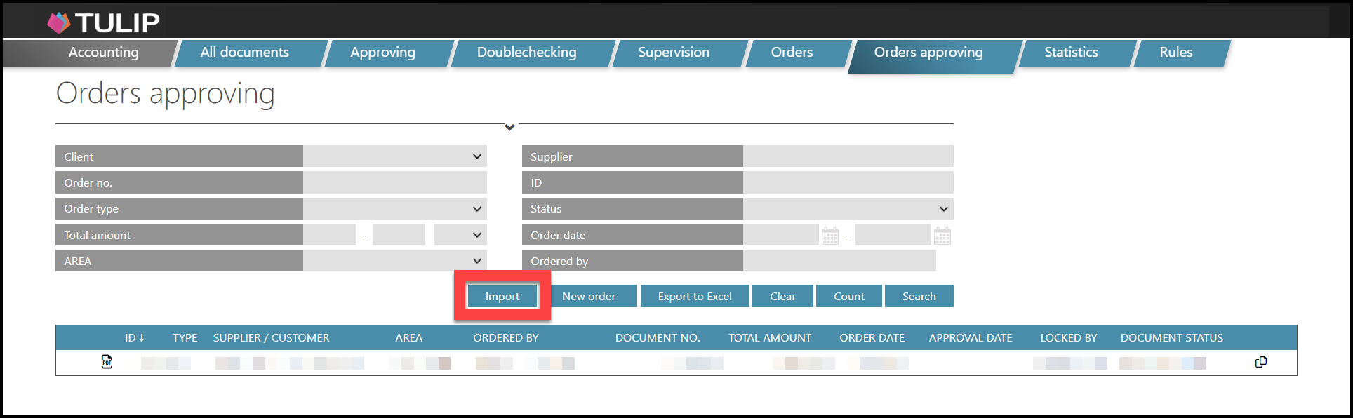 This manual includes information on importing multiple new Orders from Accounting module in TULIP. This functionality allows you to create many new Orders at once quickly. It is possible via downloading a template in an Excel sheet and then uploading it to TULIP. Usually, the Order is created by a customer. Then, it is sent to a pre-set number of approval steps (1 to 7) all according to AREA / Approval matrix. It is also possible to create Orders manually or copy an existing Order, send them for approval, create PDF documents to send in e-mails and pair Orders with Invoices.