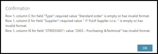 If there is any error or an issue with uploading, the system will not accept and upload the whole Excel sheet into TULIP. You will get a note that says what exactly should be corrected. Read the information carefully, correct the data and then click OK. Then, upload the Excel sheet again.