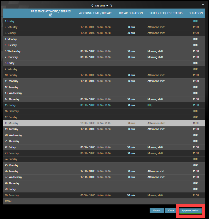 Once you click Approve period, your attendance period is confirmed and locked. Your manager will check, approve and send your attendance further to Payroll department.
