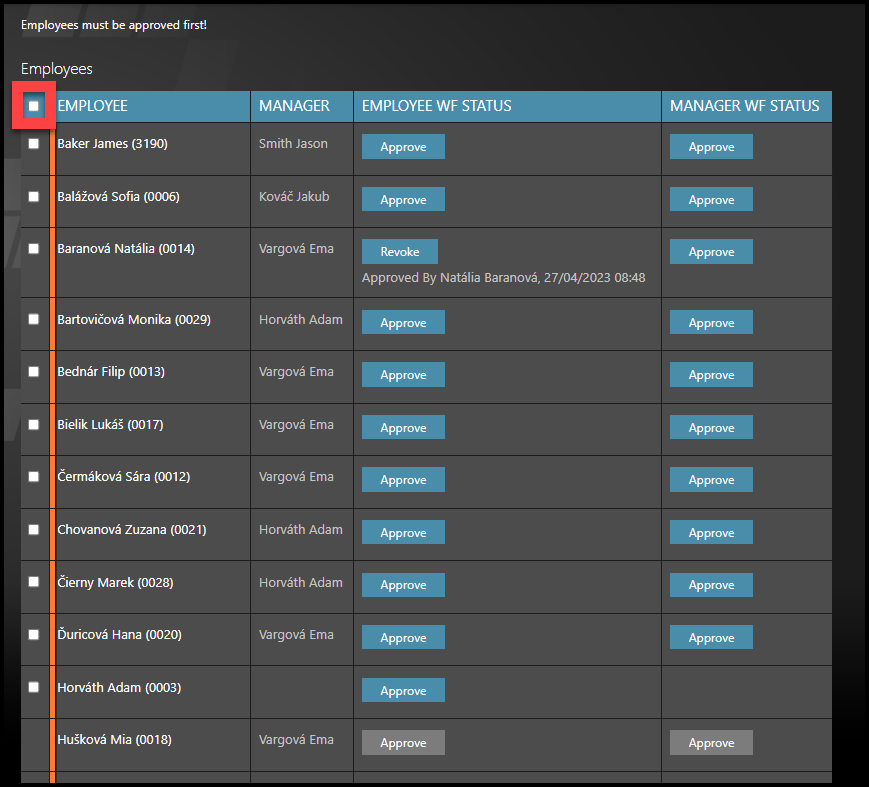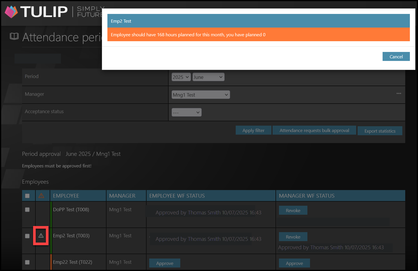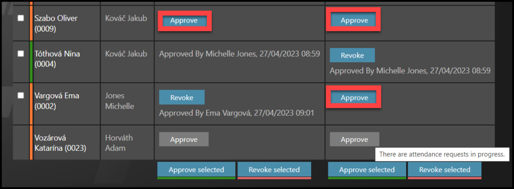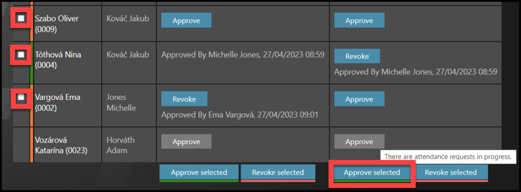 Revoke selected – re-opens the Attendance period of selected employees for changes in attendance.