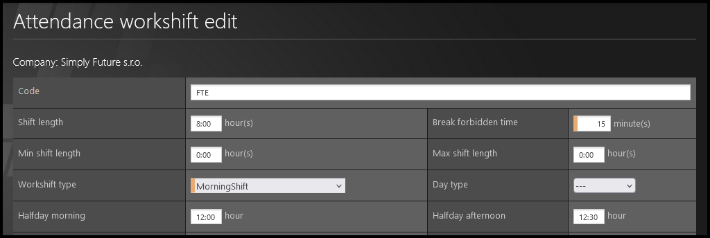 - Workshift type – used in ShiftPlan. It assigns colors & shortcuts to shifts based on the type (various extra payments to employees or other specifics can be assigned as a custom setting).