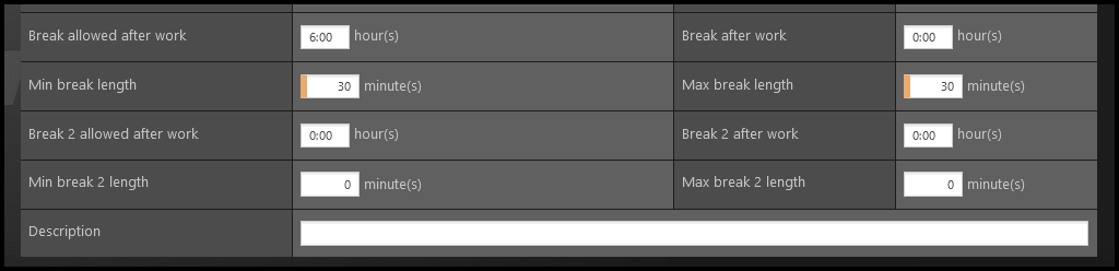 - Break allowed after work – The employee will be allowed to take a break only if he/she worked at least this amount of hours. This parameter does not restrict when exactly during those hours he/she can take a break.