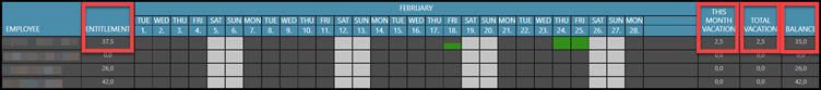- Balance: Number of remaining days to plan in Vacation Plan for all upcoming months. For example: Entitlements 20 days – This month vacation 5 days = Balance 15 days
