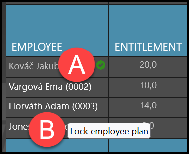 A) Locked plan – grey name, with a green ✔ check mark icon – If you lock the employee´s plan, he/she is no longer able to change the dates.