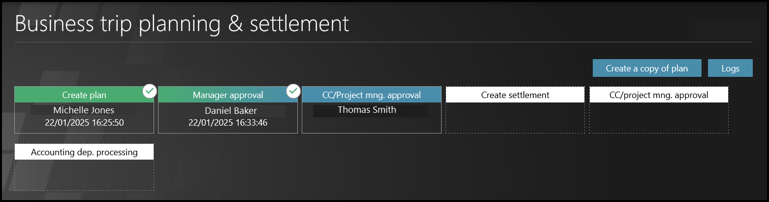 The process is started by an employee who wants to go on a business trip. He/she creates the business trip plan. It enables him/her to send it for approval to a manager and/or other departments (payroll for advance payment, reception for booking tickets etc.). Then, he/she waits until the plan is approved by a manager.