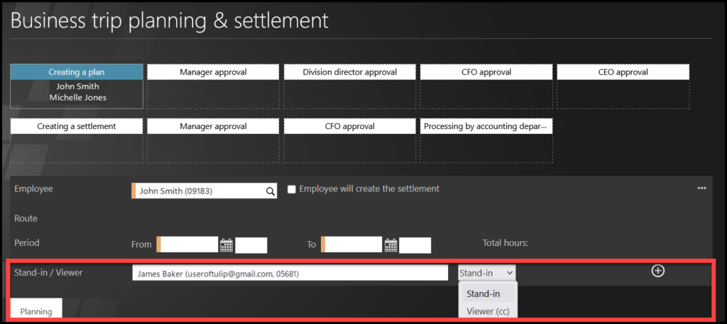 Choose Stand-in or Viewer that will be responsible for your tasks during the Business trip.