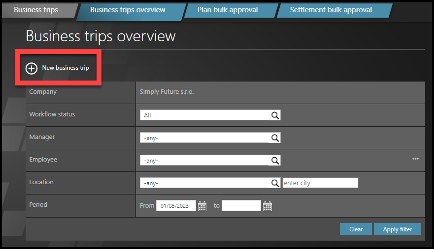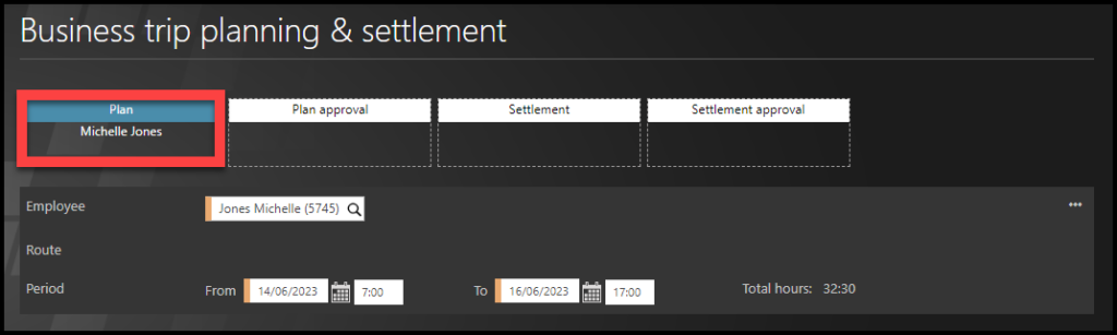 As an employee, you create your Business trip plan (insert the trip length, location, advance payment, etc.). Wait until the plan is approved by a manager, and after the return from your trip, fill in a Business trip settlement form.