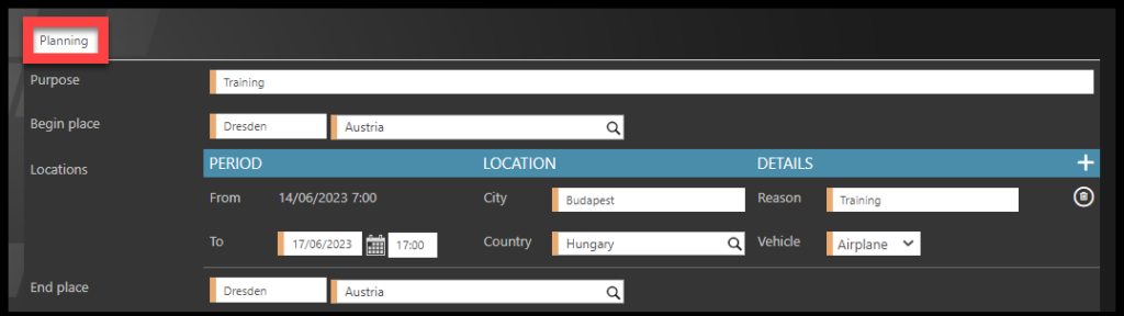 Fill in the business trip form. Fields with an orange stripe are mandatory.