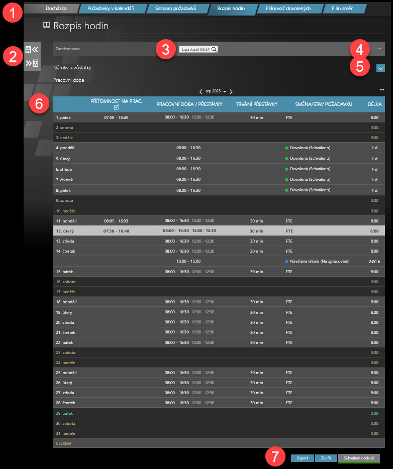 - Zaměstnanci mohou číst vlastní rozpis, v závislosti na nastavení přístupových práv jej mohou/nemohou upravovat. Mohou vytvářet vlastní požadavky v docházce a schvalovat jejich docházkové období.