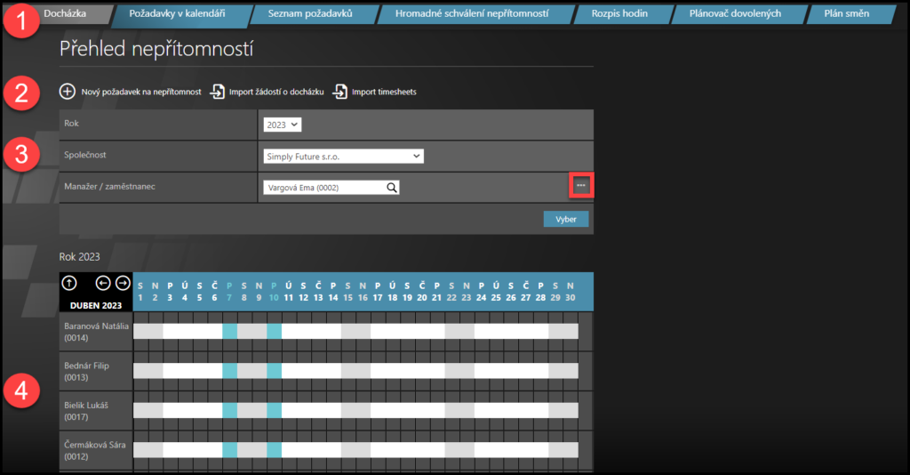 - Určená osoba (např. vedoucí, manažer…) může mít právo číst, schvalovat požadavky, schvalovat docházku svých podřízených.