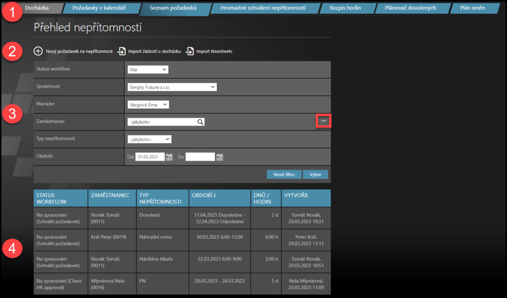 - Požadavky – seznam všech požadavek zaměstnanců, které máte povoleno zobrazit.