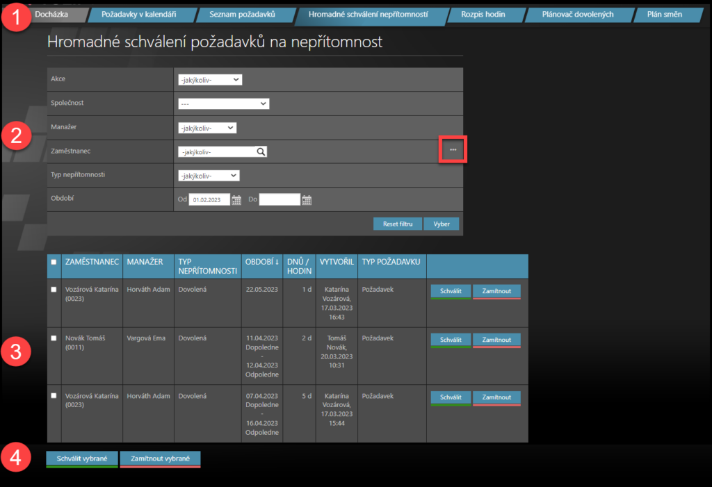 - Hromadné schvalování – můžete vybrat více zaměstnanců a požadavek najednou (zaškrtněte malé čtverečky vedle jmen a klikněte na tlačítka schválit/neschválit ve spodní části stránky.