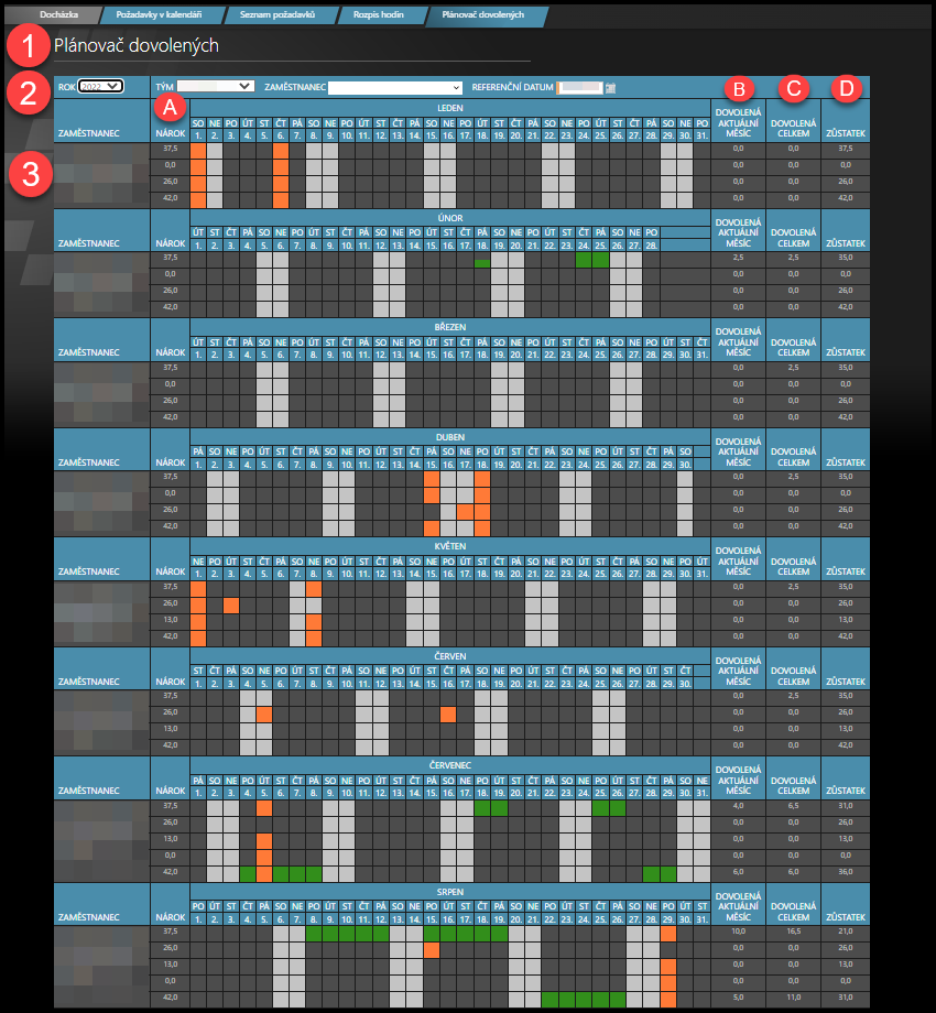 - Filtrování – rok, tým, zaměstnanci, referenční datum