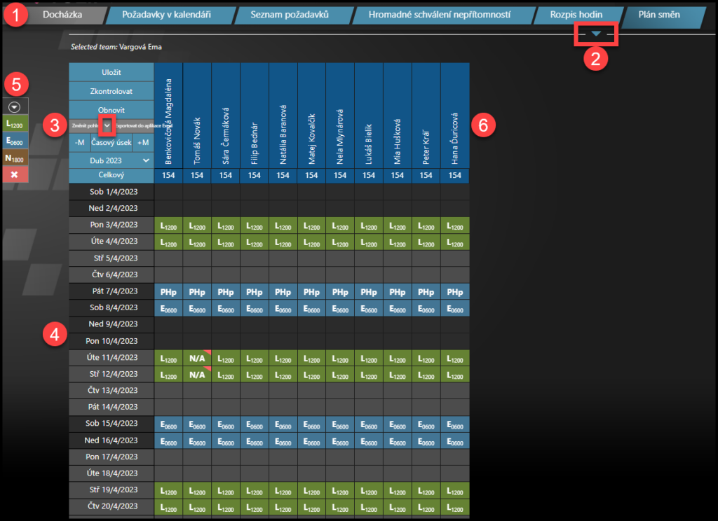 - Určená osoba (např. vedoucí, manažer, asistent…) může mít práva číst, plánovat a měnit směny a také schvalovat docházku podřízených – svého týmu.