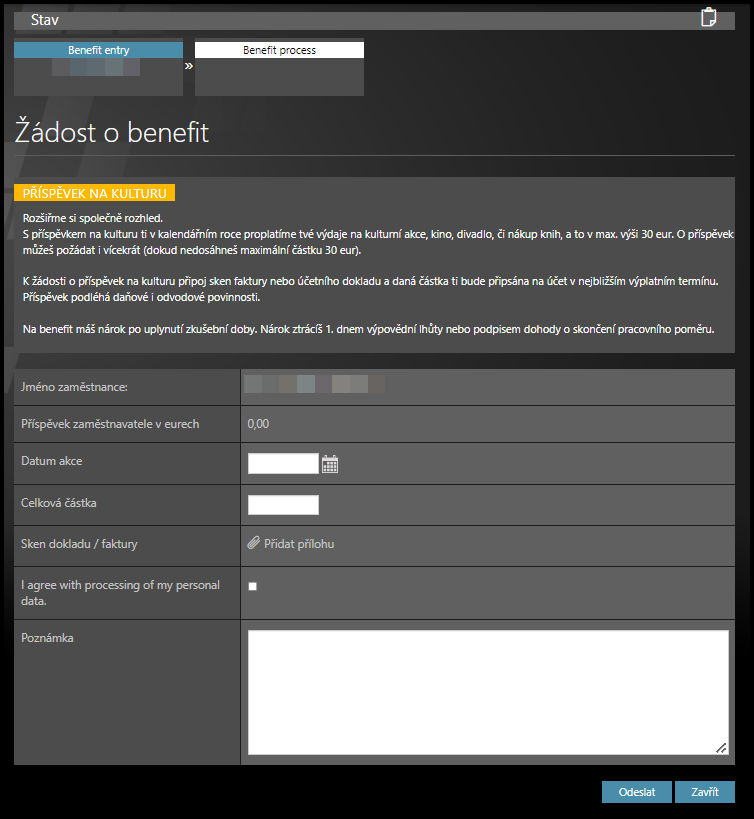 Vyplňte údaje (konkrétně pole jsou různá podle typu daného benefitu):