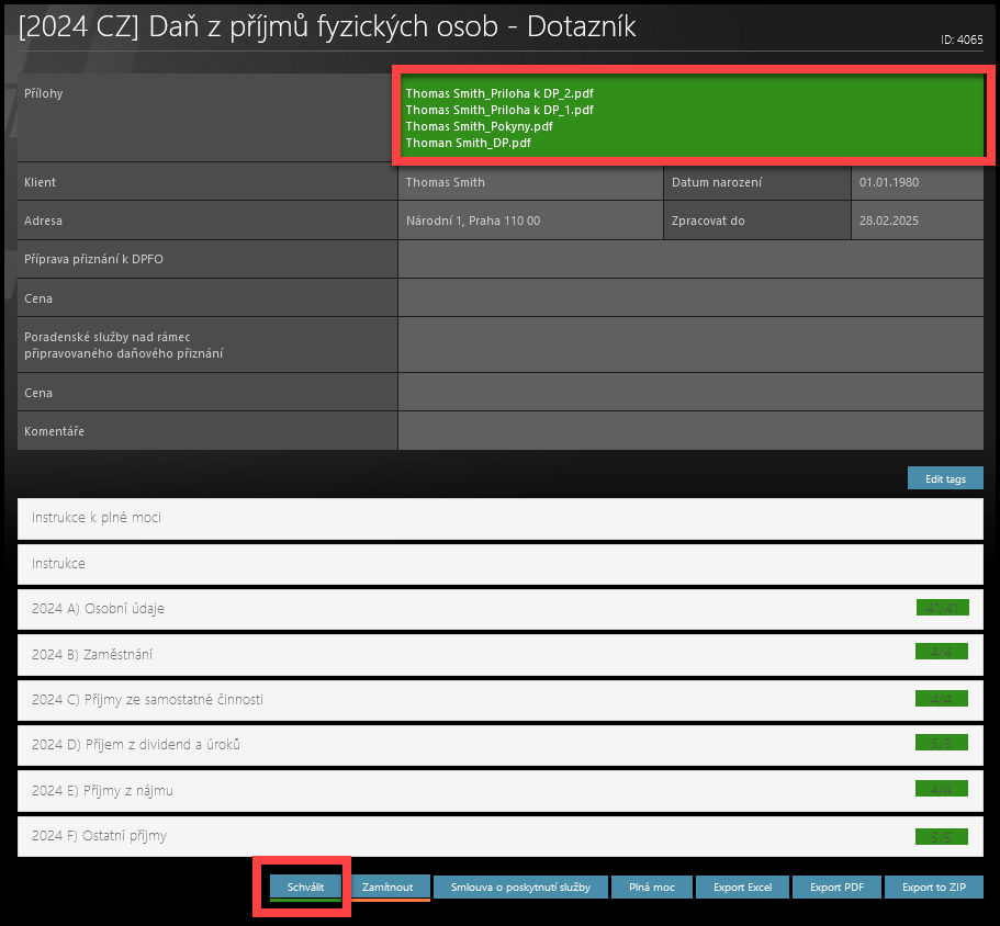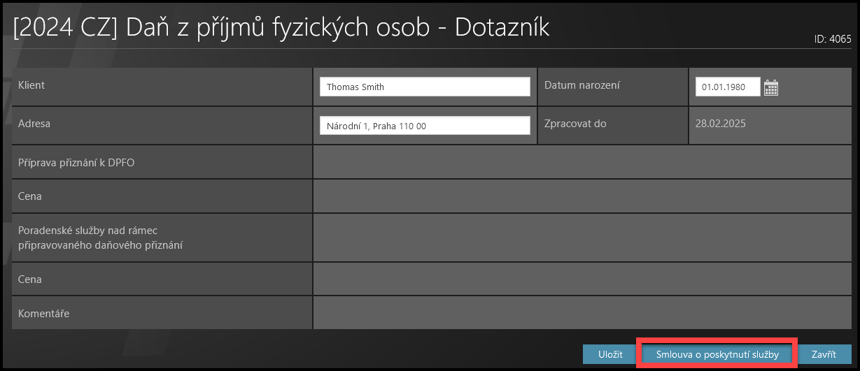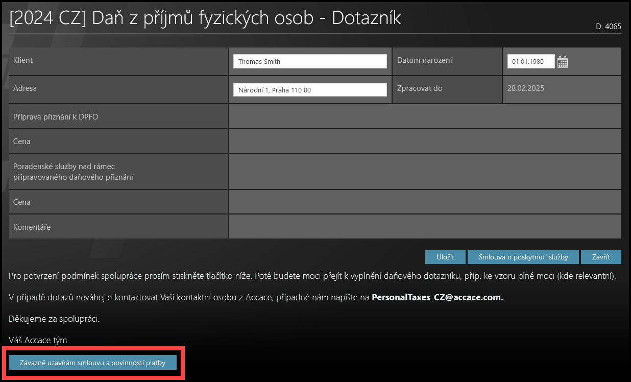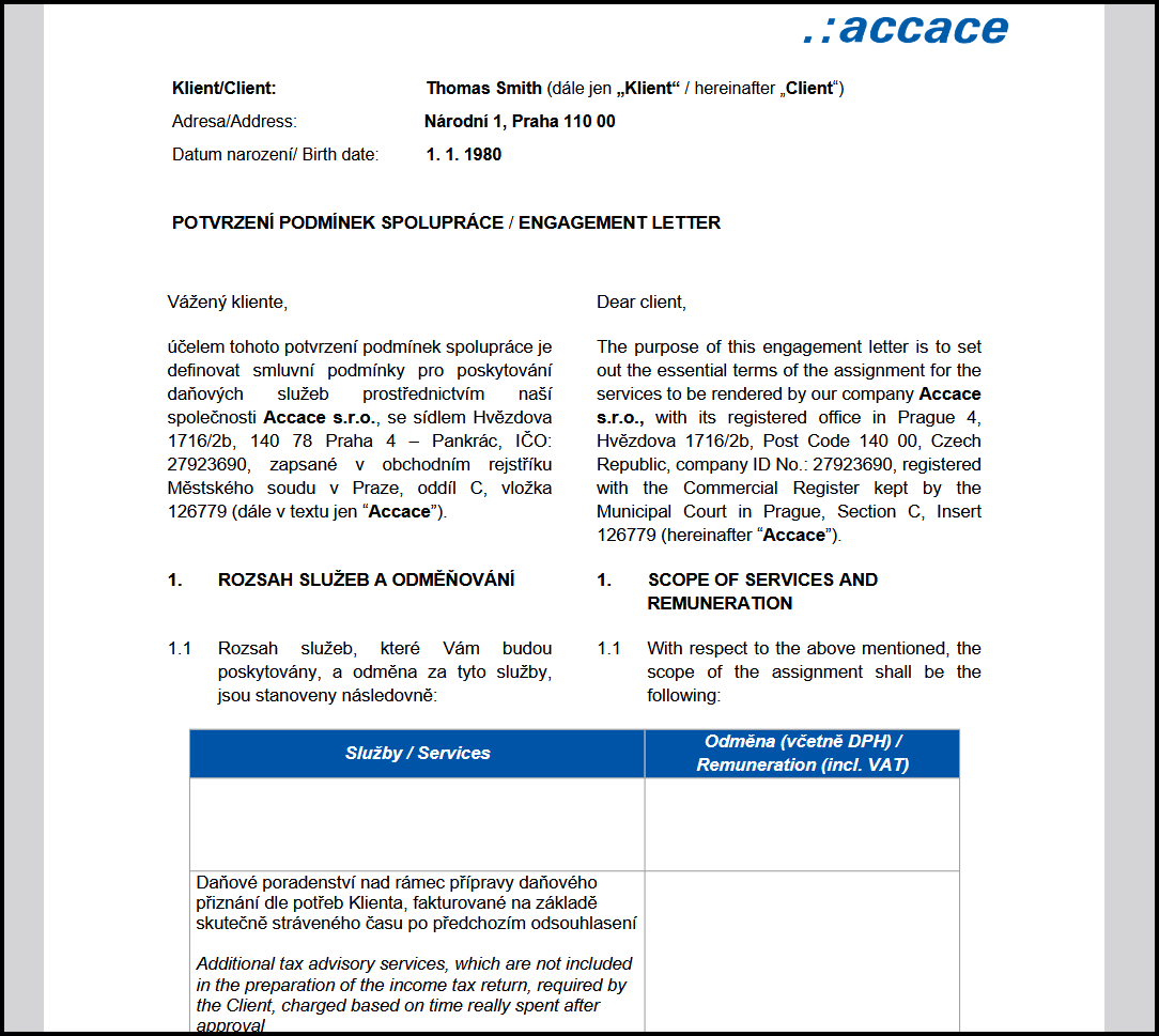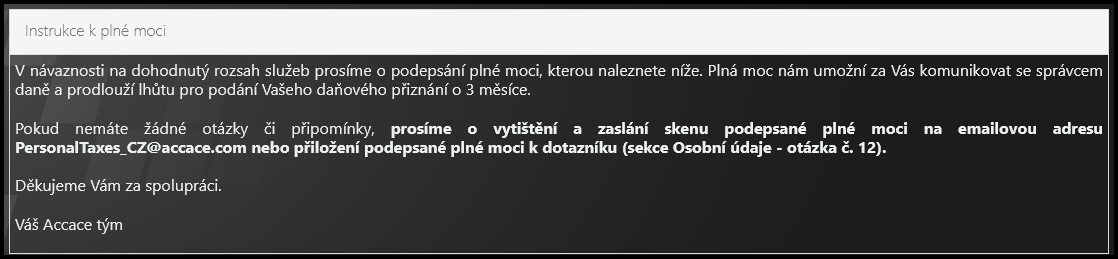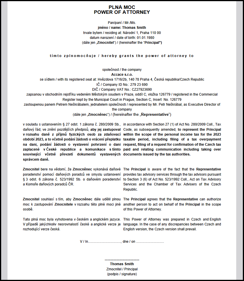 Tyto údaje slouží jako podklad pro daňové přiznání, Smlouvu o poskytnutí služby a Plnou moc.