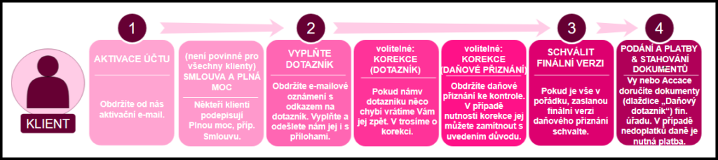 Po dobu trvání přípravy Vašeho daňového přiznání pravidelně obdržíte e-mailovou notifikaci (z adresy notifications@tulipize.com) o nejbližším kroku. Zde je kompletní postup: