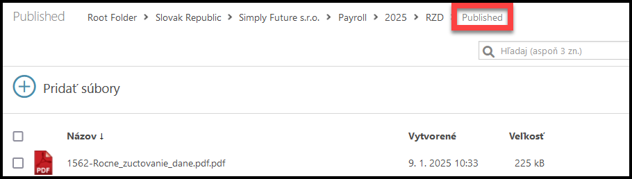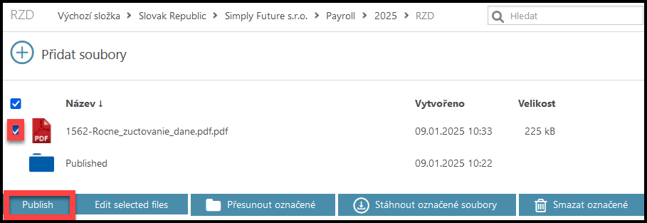 - Když nahrajete soubory do daňové složky a stisknete tlačítko Publikovat, zaměstnanci mohou vidět a stáhnout si své soubory. E-mailové upozornění je odesláno všem vybraným zaměstnancům.