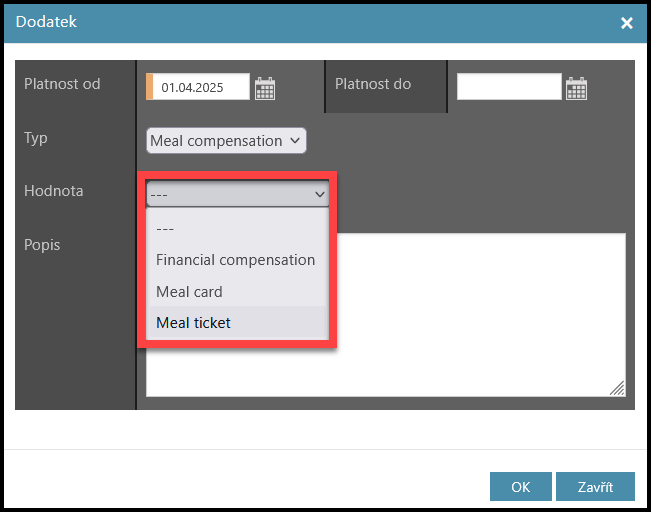 Chcete-li filtrovat pouze konkrétní typ dodatku, zvolte typ dodatku (např. Stravné).