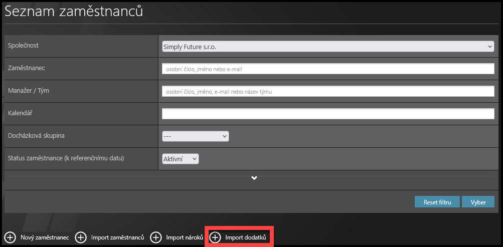 V případě potřeby si můžete vybrat společnost a filtry. Existují skryté rozšířené filtry – klepněte na malou šipku pro jejich zobrazení. Potom klepněte na Vyber.