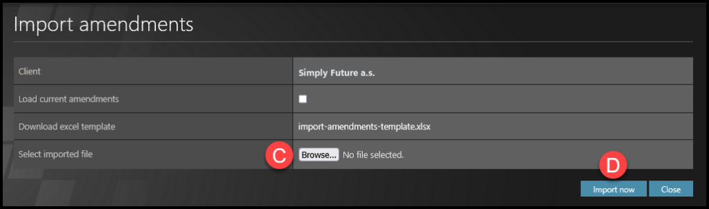 Změna dodatků: Zaškrtněte “Načíst aktuální dodatky” a poté klikněte na “import-amendments-template.xlsx”.