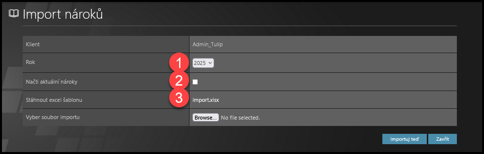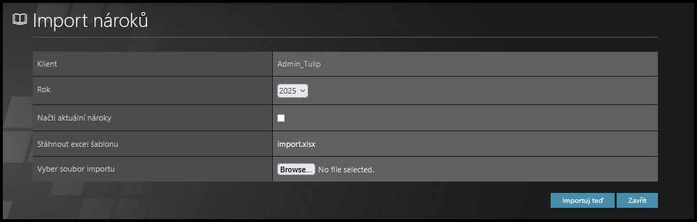 TULIP neví, který zaměstnanec má k dispozici větší nebo menší kvótu (nesleduje délku smlouvy, věk zaměstnance, počet dětí, dovolenou navíc od zaměstnavatele, individuální nároky uvedené ve smlouvě atd.) – nahrajte nárok do TULIP-u: