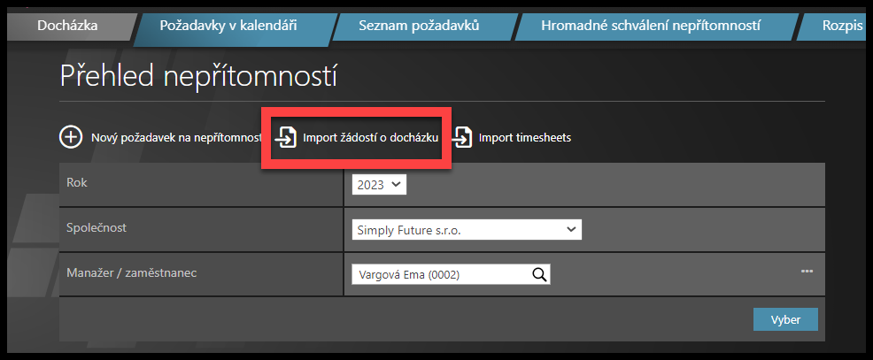 Klikněte na Import žádostí o dochádzku.