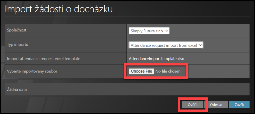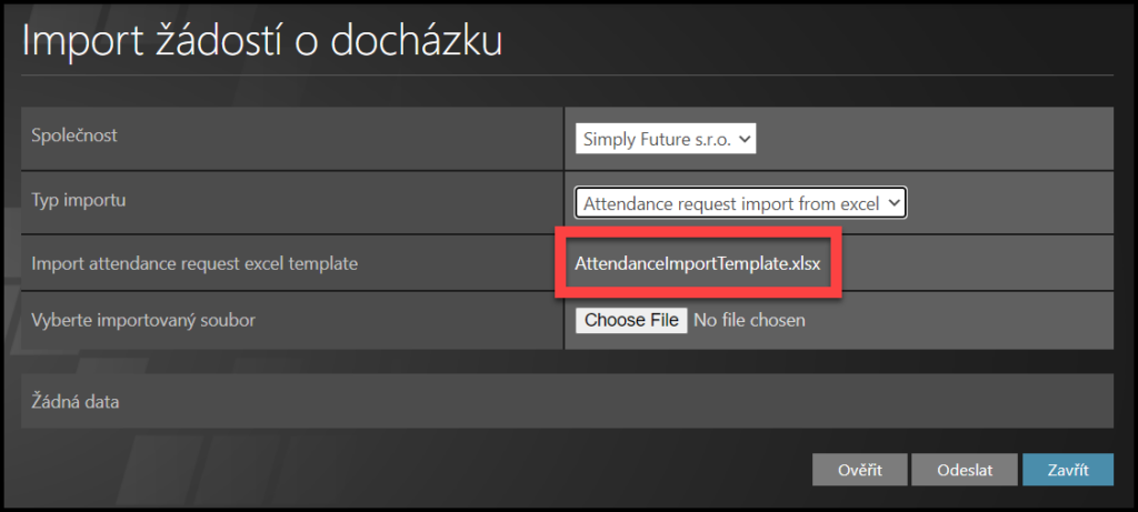 Vyberte Typ importu: Attendance request import from excel.