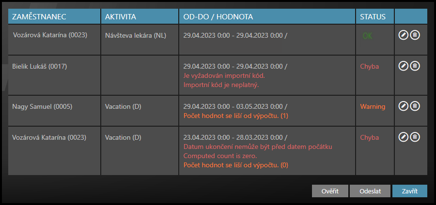 - ERROR – chyba zobrazená červeně – tento řádek nelze importovat – tlačítka Ověřit a Odeslat jsou proto zašedlá a nefungují. Viz popis chyby. Řádek musíte upravit nebo odstranit.