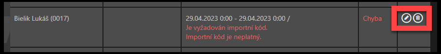- Warning v oranžové barvě – označuje chybu v importu. Viz popis chyby. Žádosti můžete importovat i s tímto varováním.