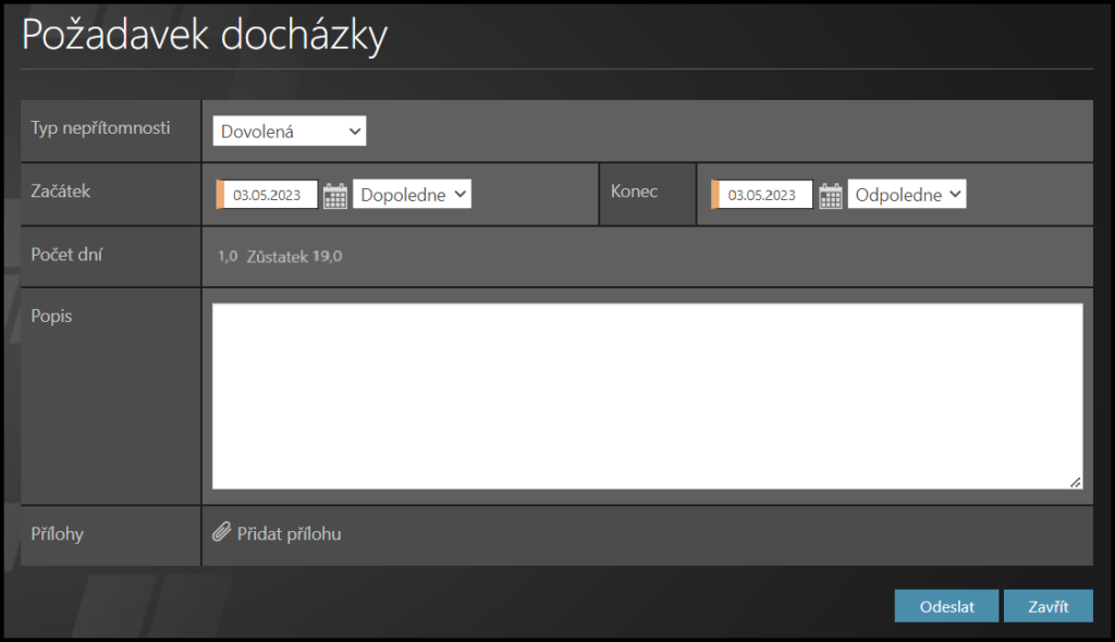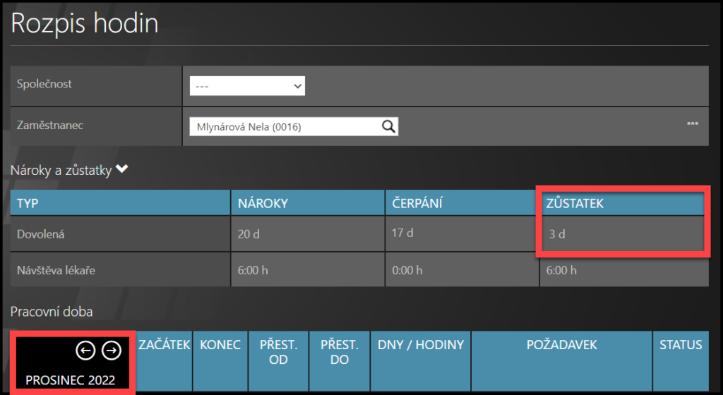 Podívejte se na sloupec Zůstatek na pravé straně tabulky. To je aktuální počet zbývajících dnů/hodin. To je počet dnů/hodin, o které můžete požádat.