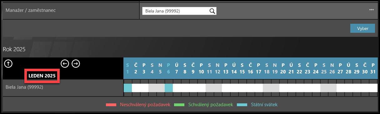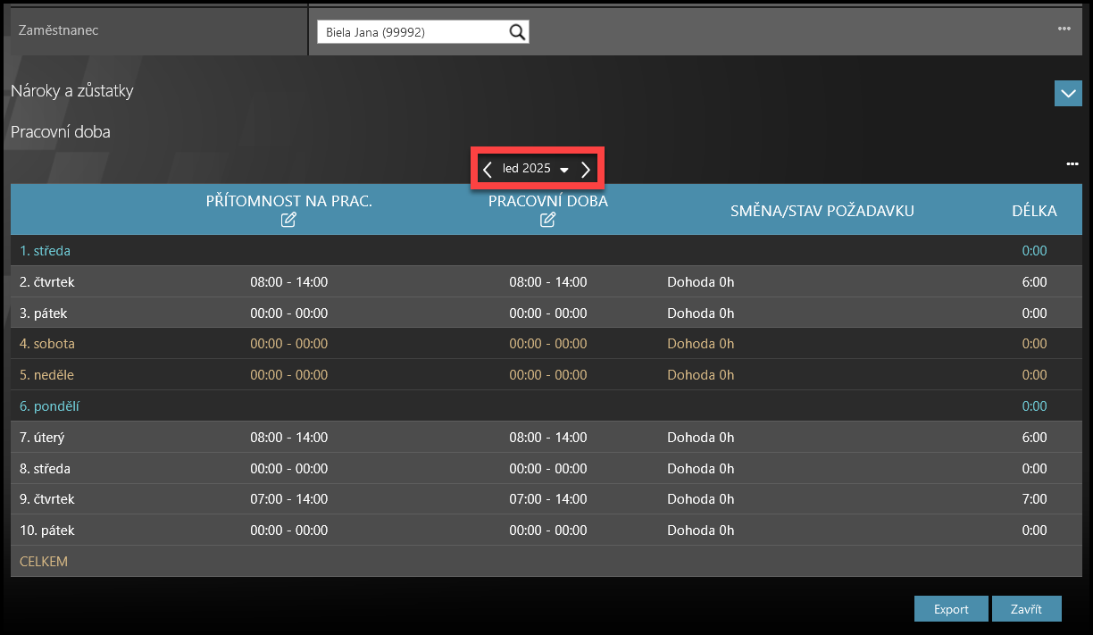 Příklad 1: Zaměstnanec na obrázku byl aktivní do 10.1.2025, proto je jeho docházka v Lednu stále viditelná.