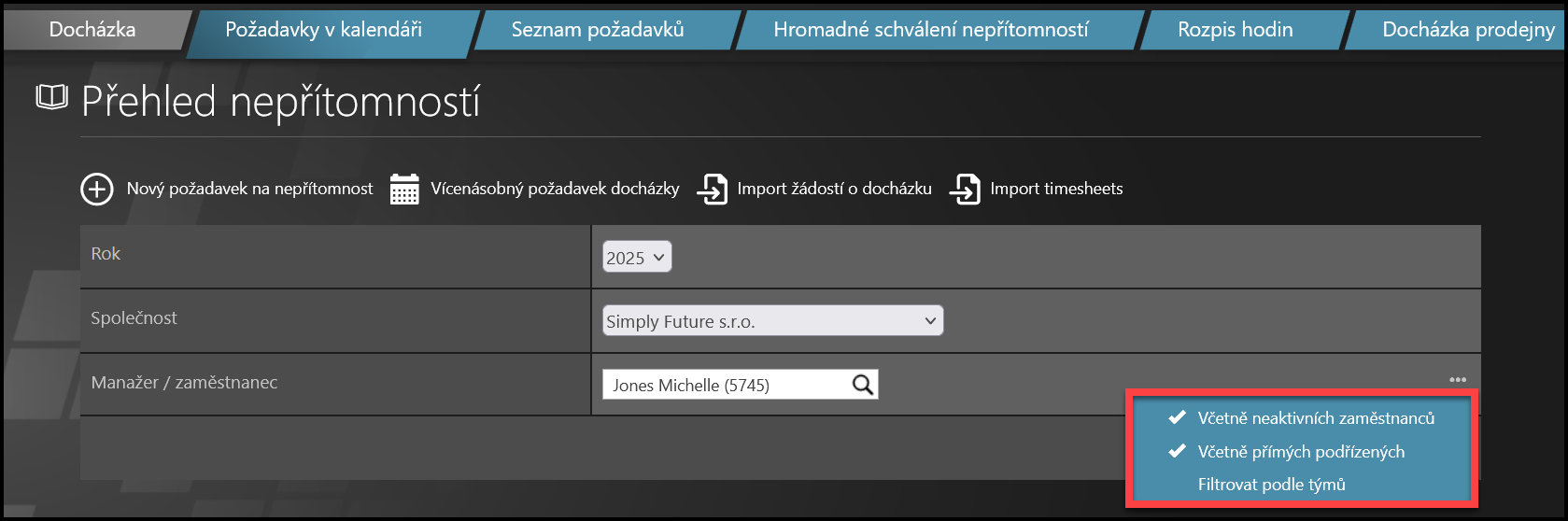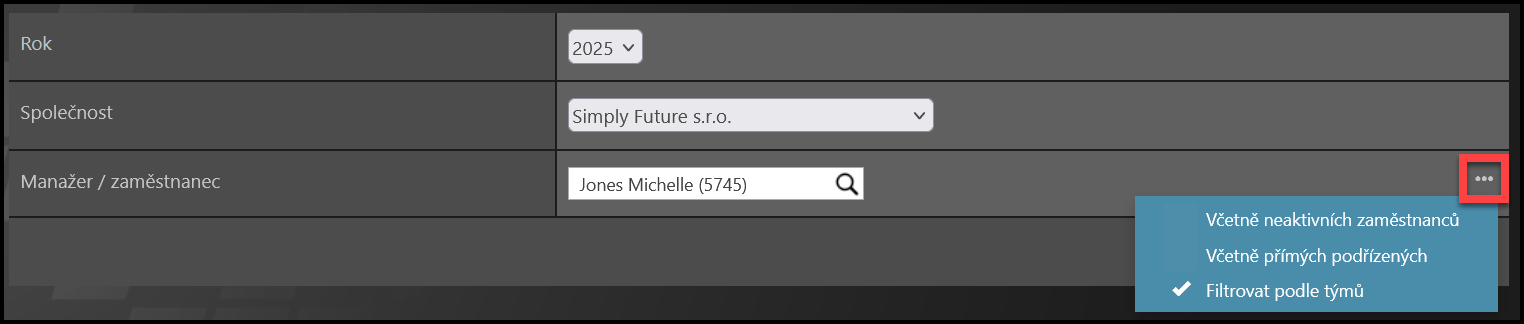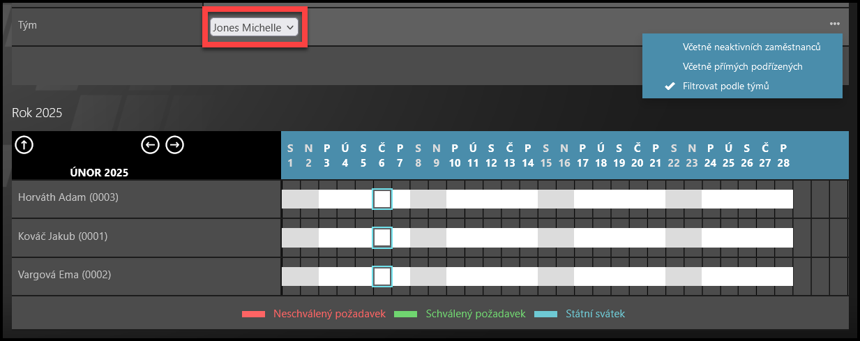 Samotný filtr se změní – lze vybrat pouze týmy, nikoli individuální docházku zaměstnance nebo manažera.