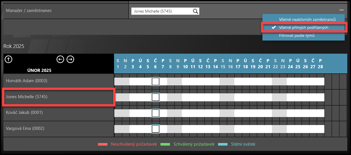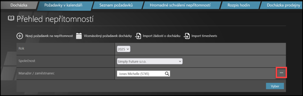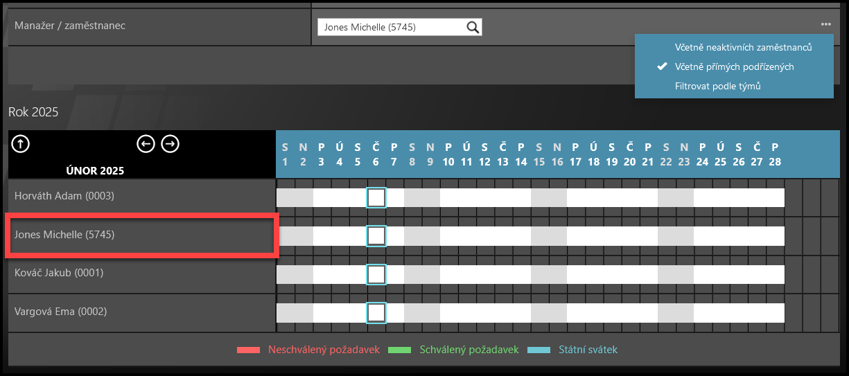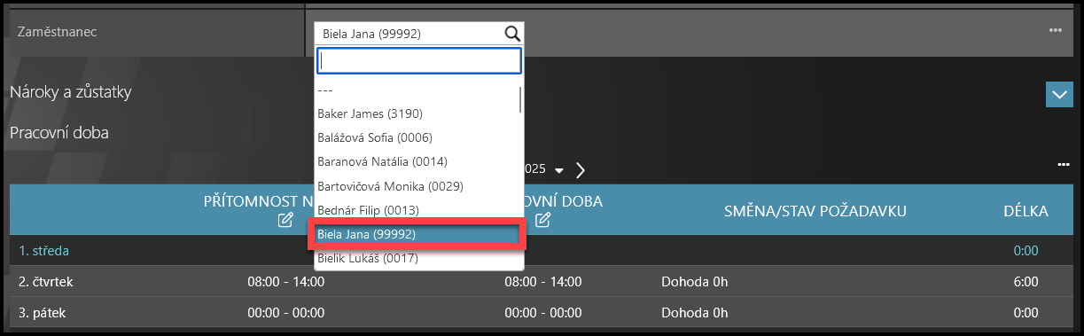 V seznamu zaměstnanců jsou dostupní k výběru všichni aktivní zaměstnanci (manažeři i podřízení), avšak pouze ti, ke kterým máte přístupová práva k docházce.
