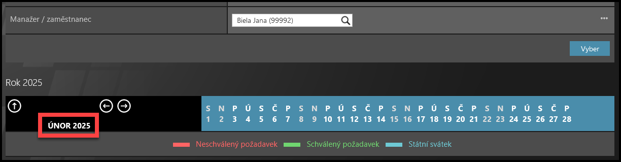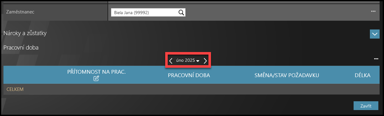 Příklad 2: Zaměstnanec na obrázku byl aktivní do 10.1.2025, jeho docházka již v ´Únoru není zobrazena.