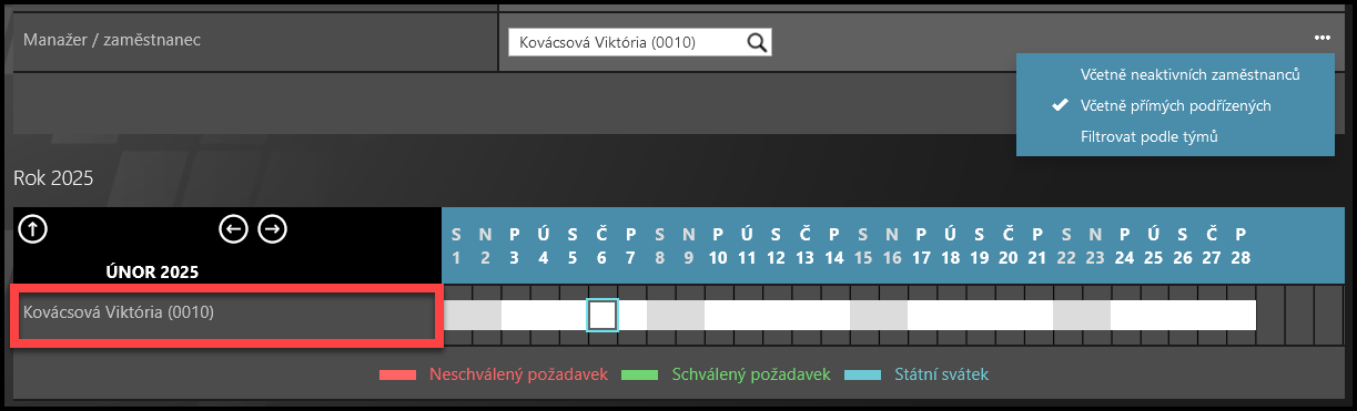 Příklad 6: Pokud si vedoucí týmu chce zobrazit svou vlastní docházku, doporučujeme nevybírat žádný filtr z této volby a filtrovat pouze podle jména vedoucího týmu (případně zaškrtnout pouze filtr “Včetně přímých podřízených”, kdy vecoucí uvidí celý svůj tým včetně sebe) .