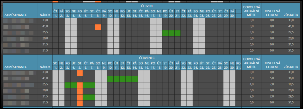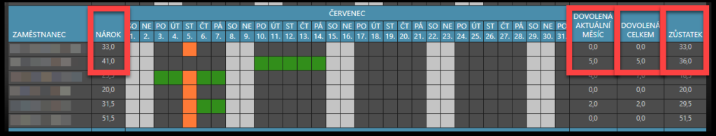 Například: Nároky 20 dní – Dovolená tento měsíc 5 dní = Zůstatek 15 dní