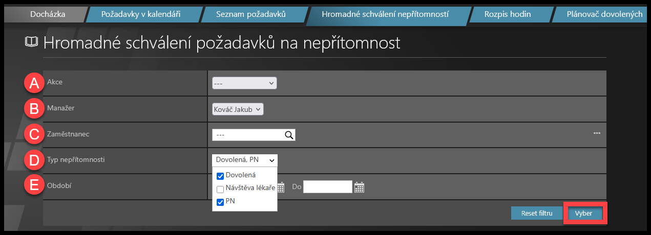 D) Typ nepřítomnosti – Vyberte a zobrazte pouze jeden typ požadavku, všechny typy požadavků nebo vyberte více typů požadavků.