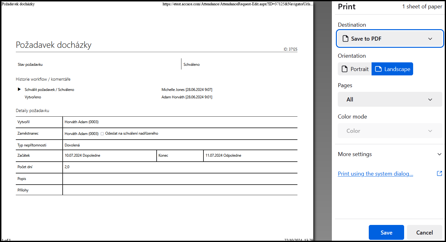 Otevřete detail požadavku a klikněte na tlačítko Tisk v dolní části obrazovky.