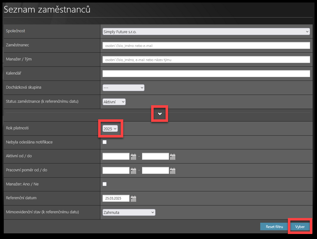 Chcete-li nahrát nárok za jiný než aktuální rok, vyberte v kroku 3 rozšířené filtry.