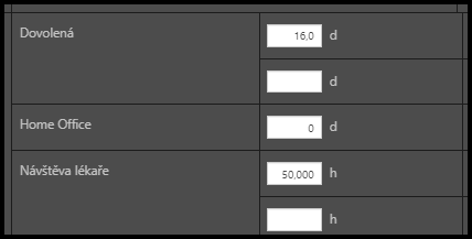 Vyplňte údaje pro nároky. Vedle prázdného pole je vždy H (hodiny) nebo D (dny).