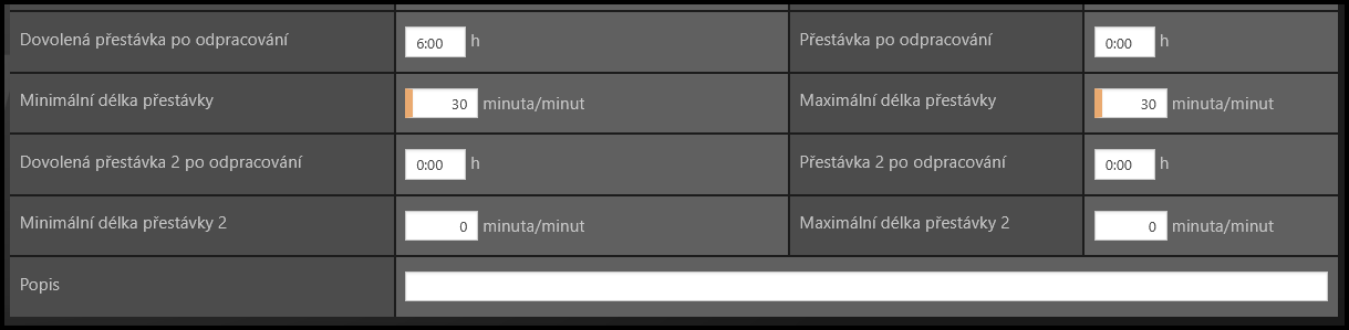 - Přestávka po odpracování – Po tomto počtu odpracovaných hodin bude zaměstnanci dovoleno udělat si přestávku. Tento parametr nás neinformuje o tom, zda zaměstnanec může či nemůže mít přestávku (např. pokud odpracoval pouze 3 hodiny, i když lze přestávku čerpat po 2 hodinách, nebude možné, pokud bude přestávka povolena pouze na směny delší než 6 hodin).